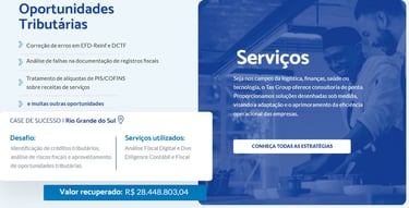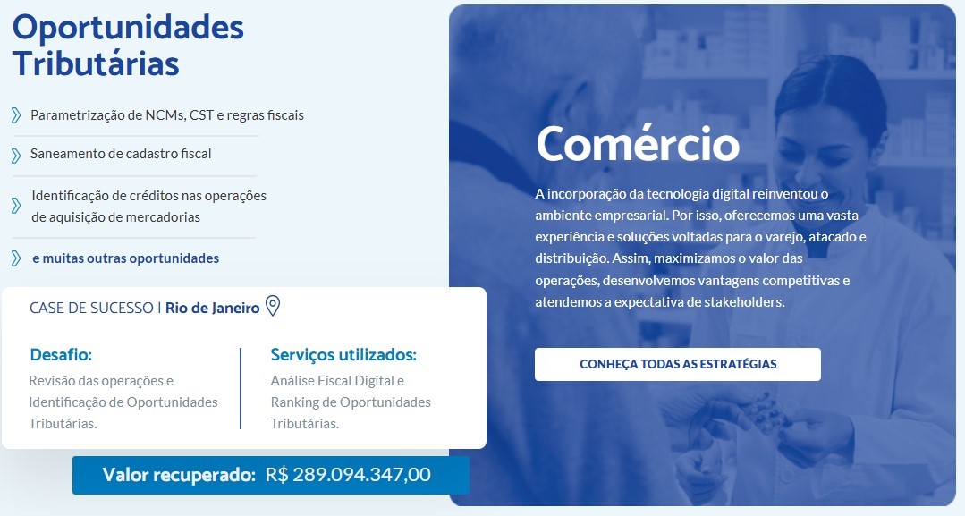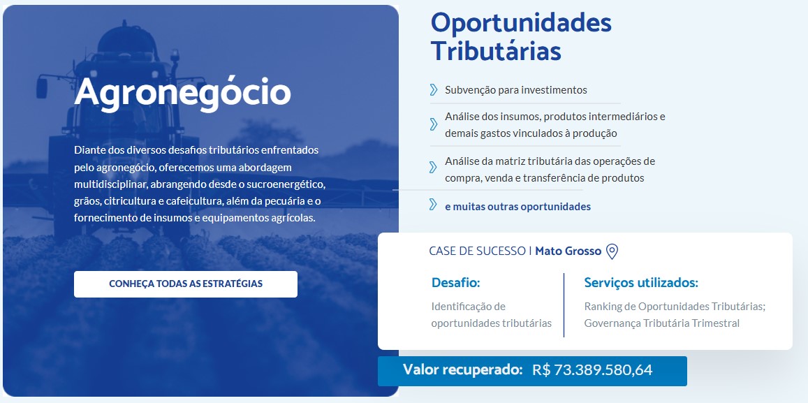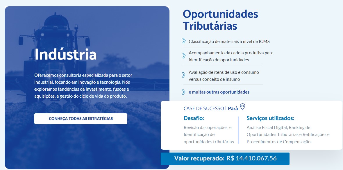 Para que o Brasil continue crescendo, é essencial que as empresas tenham acesso a recursos e projetos inovadores. Nesse sentido, desenvolvemos uma abordagem inédita no mercado, oferecendo uma visão completa na área fiscal — com soluções exclusivas voltadas ao tratamento do passado, correção do presente e planejamento do futuro das empresas. Nosso objetivo é fornecer suporte estratégico e insights precisos para impulsionar a operação de nossos clientes, onde e como eles necessitarem.